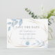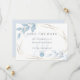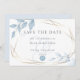 Reserve a data para casamento | Uma estrutura de tipo terrário geométrico dourado rodeia os seus detalhes e é agarrada com folhagem azul pálida e poeirenta em cantos diagonais. O inverso é um azul poeirento e pálido coordenado. Design criado para o BarefootBride™ por ©WhimsicalArtwork™ criamos esta modelo para facilitar a personalização com as suas próprias informações. Isto é parte de uma suíte coordenada de papelaria de casamento.