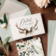 Folhagem russa, floral e escente de escadas, detalhes do casamento, cartão de cerimônia. Com uma bela folhagem de aquarela, florais brancos, fatia de madeira e escrevendo manual de roteiros. Este convite moderno certamente define o estilo para a sua próxima festa.