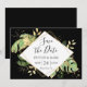 Este convite moderno de salvar a data com tema tropical apresenta folhagem exótica verde e dourada em um fundo preto. Uma moldura geométrica dourada elegante destaca o texto preto. Salpicos dourados acentuam o design botânico elegante e trazem um pouco de capricho sofisticado para o convite. Este design de oásis insular é perfeito para qualquer casamento ao ar livre, na praia ou de destino.