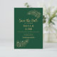 Um convite encantador para salvar a data apresenta um fundo Esmeralda emoldurado por detalhes delicados de folhas para um toque suave e elegante. O texto elegante e refinado destaca a ocasião, com espaços personalizáveis para nomes, data e endereço. Combinando design clássico com conveniência moderna.