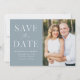 Anuncie sua data de casamento com esta na moda, foto moderna, salve o cartão de data. O design apresenta "Salvar a Data" em fontes de script e serif brancas com um fundo azul empoeirado. Personalize o minimalista para salvar o anúncio de data, adicionando seus nomes, data, local do casamento e foto. A placa se reverte para um fundo azul empoeirado sólido ou para a cor de sua escolha. A simples salvação do anúncio de data é perfeita para qualquer tema de casamento.