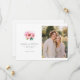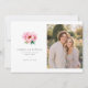 Este cartão de aviso de casamento apresenta um layout equilibrado com uma ilustração de peônia rosa suave à esquerda e um espaço reservado para foto à direita, definido contra um fundo branco limpo. O design combina uma tipografia serif elegante para nomes e detalhes do evento com uma paleta de cores românticas de rosas e verdes, criando um clima sereno e alegre. Perfeito para casais que desejam anunciar seu próximo casamento de forma elegante e sofisticada, este modelo oferece campos de texto personalizáveis para personalização, mantendo uma estética artística e harmoniosa.
