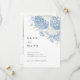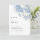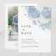 Um convite de salva datas atemporal em azul poeira e branco com foto, apresentando uma suave obra de arte em aquarela de hortênsias na frente e um layout de foto na parte de trás para sua foto de noivado ou de casal.