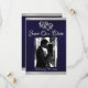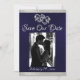 Este design romântico apresenta um elegante fundo azul-marinho com bordas de fita, espaço para a foto do casal e dois corações entrelaçados com a data do evento em letra cursiva elegante na frente. A parte traseira tem um espaço para monograma, mais informações e local para o seu site. Disponível em várias cores para o tema do seu casamento. (A fita é simulada na arte). Projetado para combinar com a Coleção de Casamentos "Two Shall Become One - Silver & Gold". Para alterar os detalhes, clique em «Personalizar». Para mover o texto ou alterar o tamanho, a fonte ou a cor do texto, clique em «Clique para personalizar ainda mais»