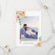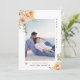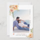 Flores de pêssego de coral Salve o anúncio da foto de Data. Uma design adorável que mostra uma foto, flores de pêssego nos cantos superior esquerdo e inferior direito, o texto "Salvar a data" em preto e coral e um coração de coral. O verso inclui um padrão de bolinhas em coral e branco.