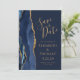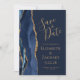 A borda esquerda deste elegante casamento moderno salve o cartão de data apresenta uma marinho azul de aquarela agata borda aparada com falso brilho dourado. O texto personalizável combina manuscrito dourado, fontes em copperplate e itálico em um fundo azul marinho. No verso, substitua facilmente a imagem de amostra por uma foto da futura noiva e noiva, e adicione algumas linhas de informações adicionais, como o URL do seu site de casamento.