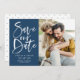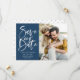 Caligrafia de Pincel de Água Azul Foto para Salvar nosso Cartão de Data | Anuncie à família e aos amigos a data do seu casamento com este cartão simples de data personalizável. Apresenta caligrafia moderna, escrita à mão, sobre fundo azul marinho. Esta foto de na moda para salvar o cartão de data é perfeita para qualquer época de casamento e tema. Outras cores e itens correspondentes estão disponíveis.