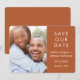 Um design moderno e simples para anunciar a data do seu casamento apresenta sua foto favorita com uma tipografia branca clássica para todos os seus detalhes importantes. A frente e o verso são terracota