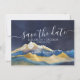 Modelo de cartões de foto para salvar a data de casamento elegante vintage moderno - Montanhas de aquarela com paisagens naturais em azul verde e folha de ouro falso.