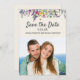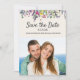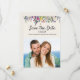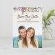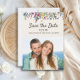 Cartão de foto "Save the Date" de casamento com belas e delicadas flores silvestres em aquarela roxas, amarelas e rosas em um fundo creme/branco.