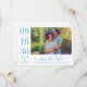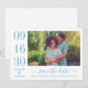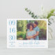 Casamento moderno e na moda guarde os cartões de anúncio de data e apresente uma foto horizontal de noivado com um design tipográfico que inclui números ousados e elegantes de datas de casamento com um simples monograma dos nomes da noiva e do noivo. Esquema de cor azul/cinza de aço empoeirado.