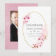 Convite de casamento com aquarela floral rosa na primavera com flor de sakura e moldura geométrica dourada personalizável para os detalhes do seu evento. Ideal para qualquer tema ou casamento no jardim.