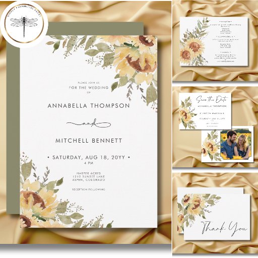 Celebre seu amor com nosso casamento ruidoso, salve o cartão de data, projetado para dar o tom perfeito para seu dia especial. Apresentando girassóis vibrantes e de cor d'água em amarelo rico ouro, marrom-terra e verde-suave, graciosamente posicionados em cantos opostos, este design combina encanto natural com elegância moderna. A fonte limpa e contemporânea adiciona um novo toque, fazer ideal para casais que amam beleza sem esforço e romance rústico. Placas gráficas de girassol criadas pela Verya Studios. Criado pela imprensa simplesmente de farmácia.