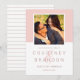 Casamento moderno salve os cartões de anúncio de data com uma foto quadrada de noivado enquadrada em cor-de-rosa claro / rosa com um monograma simples e minimalista da noiva e dos nomes do noivo com um guião elegante. Personalize o texto da data de salvamento com a data e o local do casamento. A parte traseira da placa inclui um padrão elegante de rosa empoeirado fino/riscas horizontais rosa e brancas.
