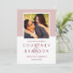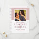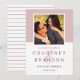 Um casamento moderno salve os cartões de anúncio de data e apresenta uma foto de noivado quadrada moldada em cor-de-rosa rosa com um monograma simples e minimalista dos nomes da noiva e do noivo com um guião elegante. Personalize o texto da data de salvamento com a data e o local do casamento. A parte traseira da placa inclui um padrão elegante de listras horizontais brancas e vermelhas e arrojadas.