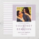 Casamento moderno salve os cartões de anúncio de data com uma foto de noivado quadrado enquadrada em lavanda clara / roxo lilac com um monograma simples e minimalista de noiva e nomes de noivo com um guião elegante. Personalize o texto da data de salvamento com a data e o local do casamento. A parte traseira da placa inclui um padrão elegante de faixas horizontais roxas e brancas e roxas.