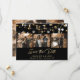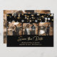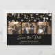 Cartões salve a data de fotos de casamento elegantes, preto e dourado, com um título de roteiro moderno. Nosso casamento salva a data mostra uma coleção de fotos de 3 imagens contra um fundo preto adornado com luzes de cordas na frente e uma foto na parte de trás. Personalize facilmente este cartão preto, salve o cartão de data com as suas imagens e detalhes do casamento.