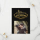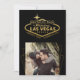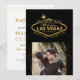 Cartão de anúncio de salva de data de foto de 5x7 para um casamento em Las Vegas, Nevada, apresentando o famoso letreiro de Vegas em falso dourado em preto com uma foto quadrada e moldura de sobreposição geométrica dourada e design de tipografia único e criativo no verso com data do casamento e detalhes do site.