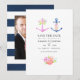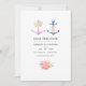 Convites de casamento com tema náutico navy e branco em tendência, apresentando uma âncora floral em aquarela e faixa navy no verso.