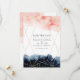 Convite de casamento com respingos de tinta aquarela azul marinho e rosa e uma moldura geométrica dourada.