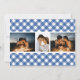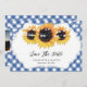 Cartões salve a data personalizados de casamento com gingham azul e girassol. Personalize facilmente esta foto floral rústica, salve a data com suas imagens e detalhes do casamento.