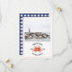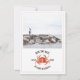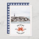 Um casamento náutico rústico salva a data com a ilustração de um caranguejo vermelho com foto personalizada na frente. O dorso é gingham azul e branco.