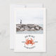 Um convite de casamento náutico rústico com ilustração de um caranguejo vermelho com foto personalizada na frente. O verso é um design inspirado em aquarela na cor chambray.