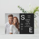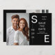 Este elegante, minimalista, simples, código QR, 2 fotos de casamento Salve o cartão de Data com fundo preto com caligrafia branca moderna e iniciais, monograma.