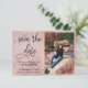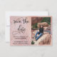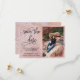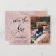 Elegante Rosa Dourado Salve a data com sua própria fotografia e ornamentado com letra de caligrafia. O modelo está preparado para você carregar uma foto do marmelho e personalizar com sua data de celebração. O design tem uma tendência de mistura de fundo de folha de ouro rosa, cor de água, pastilhas de folha de ouro rosa e folhagem delicada com brilho de poeira. Por favor, navegue na minha loja para coordenar cartões RSVP, adesivos e convites para quinceanera, com e sem fotos.
