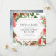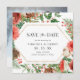 Este belo casamento de férias moderno salve a data do anúncio mostra elegantes flores vermelhas de aquarela com bagas ocas, pinecones e verde. A parte traseira do cartão inclui uma foto para personalização. Localize itens correspondentes na Coleção de Natal Botânico de inverno Vermelho Feriado.