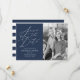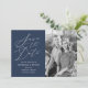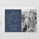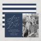 Cartões salve a data de fotos elegantes com "Salvar a Data" exibidos em um script de caligrafia branca com fundo de marinho. Personalize o marinho para salvar as datas com sua foto vertical do noivado, nomes, data do casamento e local. A parte traseira do moderno save the date card contém faixas marinho e brancas.