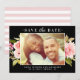 Cartão de casamento com data para salvar apresenta uma foto de noivado horizontal emoldurada por flores em aquarela com folhagem verde e tons pastéis de rosa, rosa claro e pêssego de dália e rosa de primavera e verão. Listras brancas horizontais adornam a parte de trás do cartão. O fundo preto e rosa pode ser personalizado para combinar com as cores do seu casamento.
