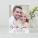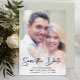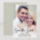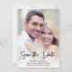Cartão de anúncio de casamento moderno e personalizado com os nomes dos noivos, data e local do casamento, escrito à mão.
