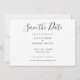 Este cartão de save the date de roteiro elegante apresenta sua foto especial sobreposta com um save the date elegante acima de seus nomes, data e local em tipografia branca. O verso tem detalhes adicionais de save the date, incluindo o seu site de casamento, com o seu endereço de devolução e espaço para o endereço do seu destinatário. Projetado por Thisisnotme©