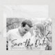 Moderno salve o cartão de data com a foto horizontal do noivado com "Salvar a Data" exibida em uma sobreposição de script preto manuscrita. Personalize a frente da foto, salve a data com seus nomes, data do casamento e local do casamento. A placa se reverte para exibir um design de mármore elegante branco e cinza de .