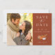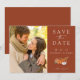 Este elegante cartão de aviso de casamento apresenta abóboras e folhas pintadas à mão em aquarela sobre um fundo de terracota com os nomes dos noivos e a data do casamento.