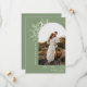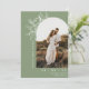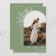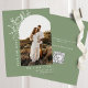 Um novo casamento moderno salve o anúncio de data em verde sábio com sua foto favorita em um arco com uma linha traçada de buquê floral em branco espiando para trás. Adicione o seu website de casamento Código QR ao contrário.