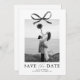 Esses cartões de dia salvam os cartões de data apresentam um fundo branco moderno, com uma peça central de fotos, e um clássico arco preto de aquarela. Na parte de trás está outra foto e mais detalhes sobre seu futuro casamento.
