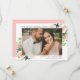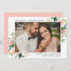 Anuncie seu casamento com nosso na moda, elegante salve os cartões com fotos. O cartão com fotos save the date apresenta a sua foto de noivado favorita emoldurada por flores brancas e embaçadas de aquarelas e folhas verdes esmagadas. Personalize adicionando seus nomes, data do casamento, cidade do casamento e estado e detalhes do convite. Projetado para coordenar com a nossa coleção de casamento Blush Florals.