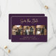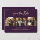 Elegante personalizado cartões salve a data de fotos de casamentos roxos e dourados com um moderno título de roteiro de folha de ouro falso. Personalize facilmente este roxo, salve a data com suas imagens e detalhes de casamento, incluindo um site de casamento.