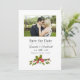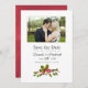 Anuncie o seu dia especial com este elegante save the date de casamento de Natal, apresentando azevinho festivo, hera e rosas vermelhas combinadas com a sua foto favorita. Perfeito para um casamento de Natal ou inverno, este design captura a beleza atemporal da estação com a sua rica folhagem e flora sazonal. Ideal para casais que desejam adicionar um toque festivo e romântico à sua papelaria de casamento.