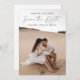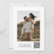 Anuncie seu próximo casamento em estilo com este código de QR moderno do Script Preto Moderno salve o cartão de data! O design apresenta "Save the Date" (Salvar a data) exibido na cobertura de caligrafia preta da tendência com a sua foto de noivado vertical e de sangria de cheio. Personalize a frente do minimalista, salve a data com seus nomes, data do casamento e local. A parte traseira do cartão exibe uma imagem adicional com um código QR para os convidados digitalizarem para visitar o site do seu casamento. O branco e preto chico salvam a data a escolha perfeita para casamentos modernos.