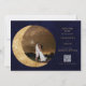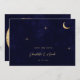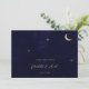 Um convite de casamento celestial moderno minimalista apresenta uma design simples e elegante. Inclui uma lua de folha de ouro e estrelas que brilham suavemente, colocadas sobre um fundo azul-da-noite. O convite usa a tipografia serif clássica, que adiciona um toque tradicional e formal com seu estilo limpo e limpo.