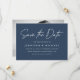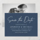 Simples salve o cartão de data com "Salvar a data" em um script manuscrito branco com um fundo marinho/denim. Personalize o cartão de data moderno adicionando seus nomes, data do casamento, local do casamento, site do casamento, etc. O minimalista para salvar a placa de data reverte para exibir sua foto de noivado horizontal favorita.