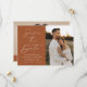 Anuncie seu próximo casamento em estilo com esta tenda foto do moderno Script Terracotta, salve o cartão de data! O design apresenta "Save the Date" (Salvar a data) exibido na caligrafia branca com fundo de terracota. Personalize a frente do minimalista, salve a data com seus nomes, data do casamento, local e foto vertical do noivado. A parte de trás do cartão exibe uma foto horizontal com o site do seu casamento mostrado abaixo. O terracotta chic salva a data a escolha perfeita para casamentos modernos.