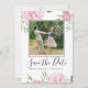 Aprecie seus convidados com esses cartões salve a data florais com peões pintados cor-de-rosa. Esta placa possui um espaço onde você pode adicionar uma foto de noivado