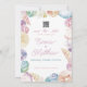 Este conjunto de papelaria de casamento apresenta ilustrações de conchas em aquarela em tons pastel suaves que variam de roxo a amarelo, aquamarine, azul-turquesa, laranja e rosa.