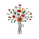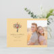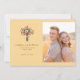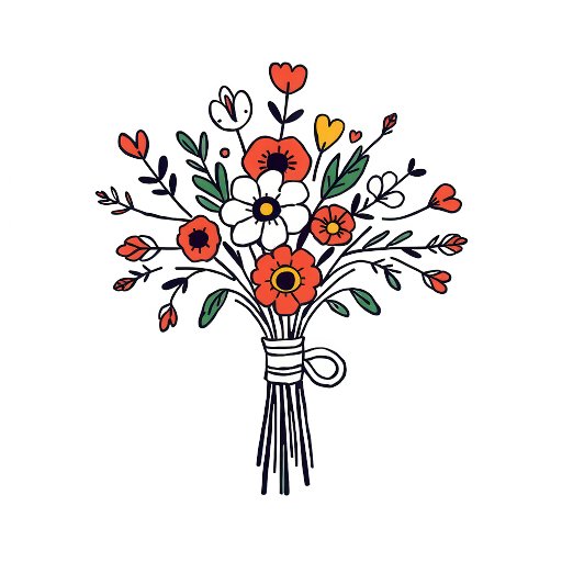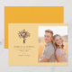 Este convite de casamento apresenta um layout dividido com um buquê ilustrado à esquerda e uma foto do casal à direita. O design utiliza uma paleta de cores quente e convidativa de amarelo pálido, vermelhos vibrantes, brancos suaves, amarelos brilhantes e verdes profundos, criando um clima alegre e romântico. A tipografia serifada elegante é usada para os nomes e detalhes, adicionando um toque de sofisticação à estética geral. A composição equilibra elementos visuais e texto, garantindo clareza e foco, mantendo uma aparência limpa e elegante, perfeita para anunciar uma ocasião especial.