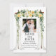 Elegante Canopy Watercolor Amarelo Noivado Floral Amarelo de Casamento Branco Salve O Cartão de Data inclui belas rosas amarelas e rosas brancas. O arco da copa do casamento da madeira inclui vegetação botânica. Foto do casal.
