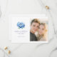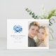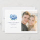Este convite de casamento "save the date" apresenta um layout dividido com uma grande e elegante ilustração de peônia azul de um lado e um espaço reservado para uma foto de um casal do outro. O design usa uma paleta de cores suaves em tons de azul e verde, criando uma atmosfera romântica e serena. O texto é organizado em uma fonte serifada clássica, adicionando à elegância atemporal do convite. Perfeito para casais que desejam definir um tom alegre e sofisticado para suas núpcias futuras.